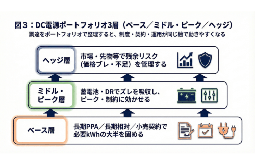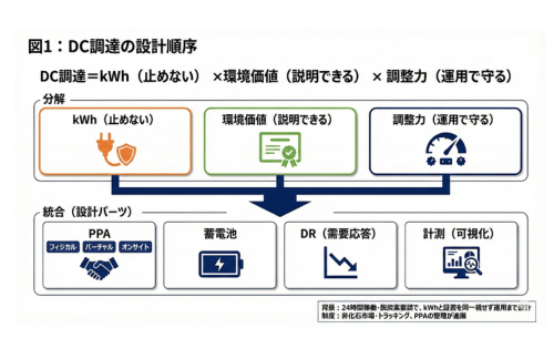 DC調達は、kWh(止めない)×環境価値(説明できる)×調整力(運用で守る)に分解して設計し、PPA(フィジカル/バーチャル/オンサイト)と、蓄電池・DR・計測(可視化)を一体として、最終的に電源ポートフォリオとして束ねるのが、設計上において、実務上の最短経路です。