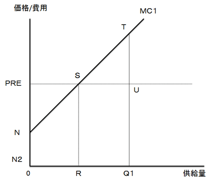 義務対象者がRPS市場においてプライステイカーであり、再生可能エネルギー電力の市場価格がPREであると仮定すると、義務対象者の達成費用の最小化行動は、Rまでは自ら再生可能エネルギー発電を行い、残りの[Q1-R]にあたる再生可能エネルギー電力分は他から購入することで義務の達成を行うことです。