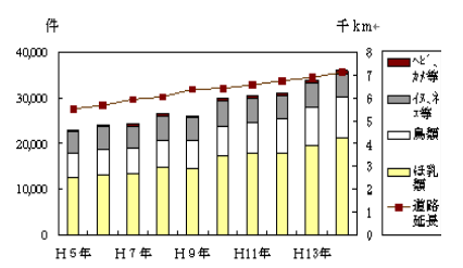道路延長とロードキル件数の推移 出典:国土交通省国土技術政策総合研究所