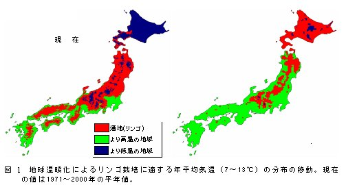 しかし、このまま地球温暖化が進むと冷涼な地域はなくなり、リンゴの適地が北上していき長野県でリンゴを生産することが難しくなると考えられます(図1)。