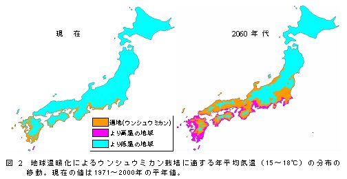 さらにおいしいミカンを作るためには8~10月にかけて日照時間が多いことが重要です。現在では東北地方や関東地方では生産することは難しいですが、このまま温暖化が進めばこれらの地方でミカンの生産ができるようになるかもしれません(図2)。