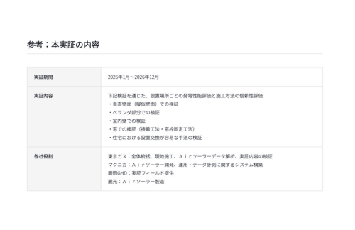 本実証では、飯田GHDが提供する日野市のモデルハウス*3を活用し、マクニカと麗光が開発・製造するAirソーラーを、東京ガスが開発する施工方法により設置し、設置場所ごとの発電性能の評価、施工方法の信頼性評価を行います。東京ガスは、これまでの太陽光発電に関する研究や事業で培ってきた施工・解析技術を本実証に転用します。マクニカは、これまでのペロブスカイト太陽電池に関する実証事業で培った豊富なノウハウを活かし、本実証へ技術力を提供します。